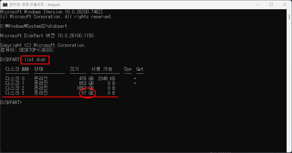 3. list disk 를 입력하고 디스크번호를 확인하기.