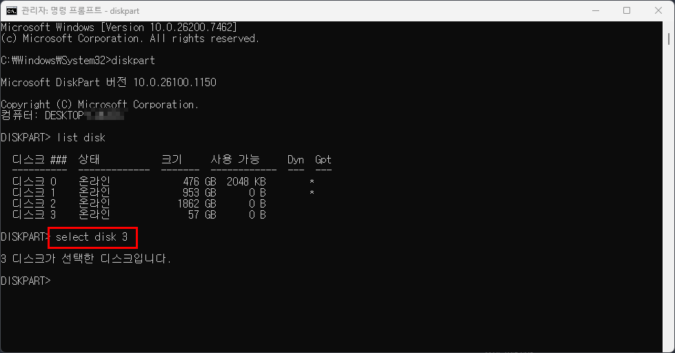 4. select disk 3 으로 디스크를 선택하기. (각자의 하드디스크 수량 및 상태에 따라 USB 디스크의 번호가 다를 수 있습니다.